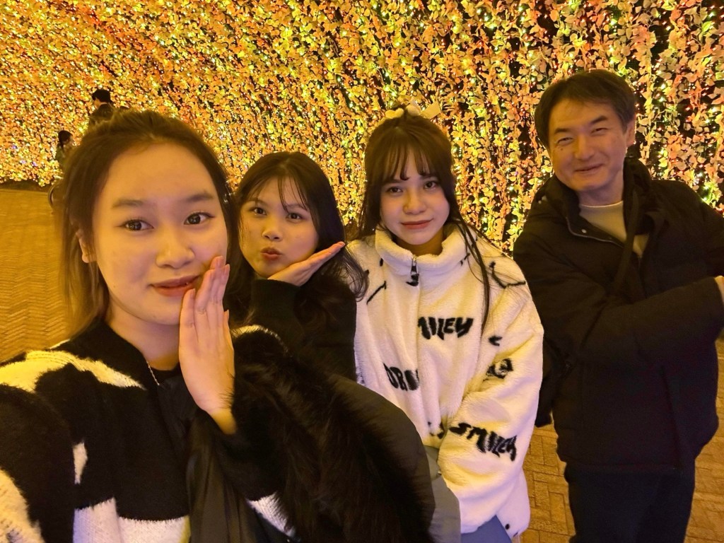 木曽三川公園のイルミネーションを見に行こうと思ったら閉館してたので、なばなの里まで足を伸ばしました。実習生も喜んでくれて良かったです。